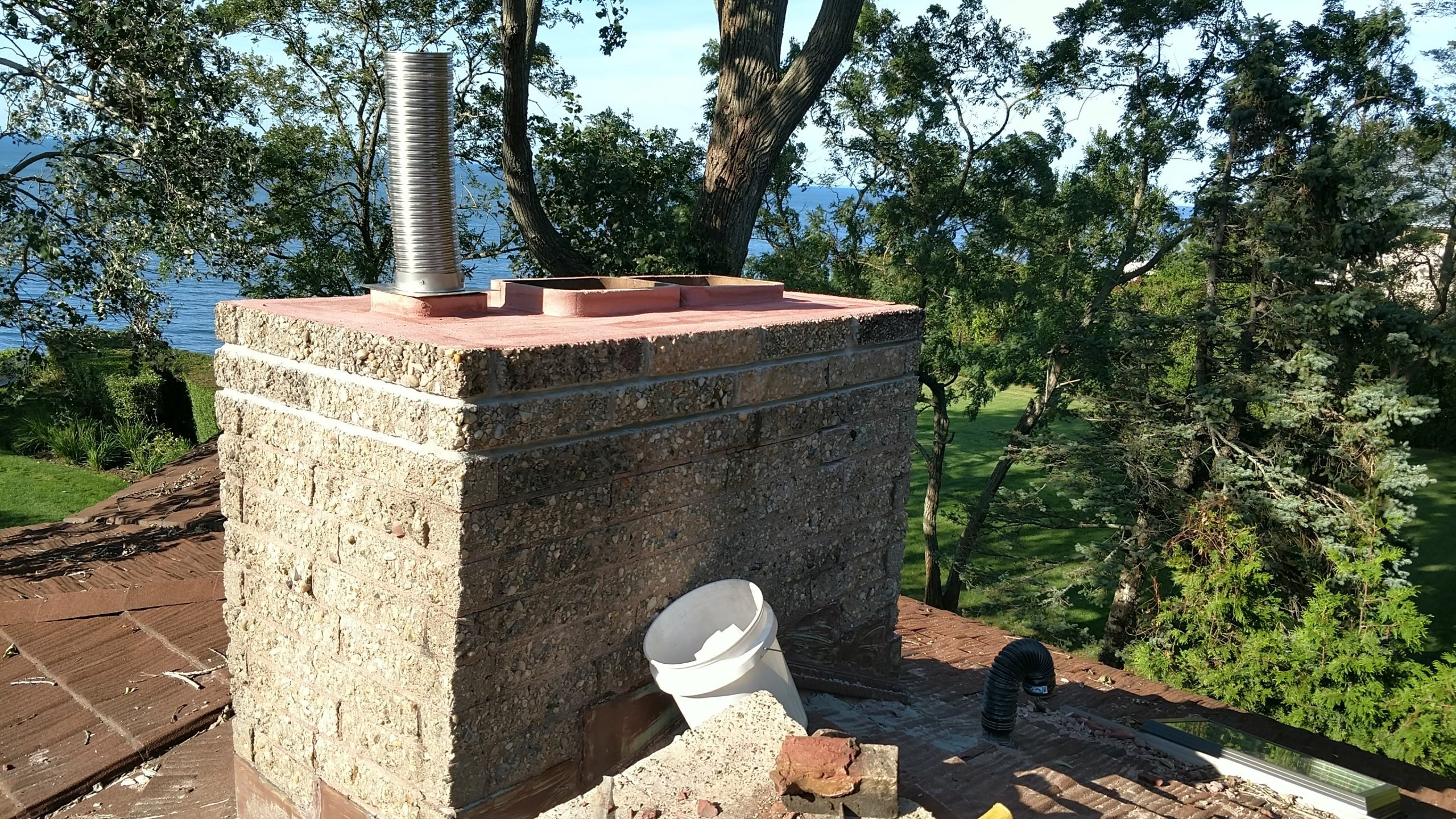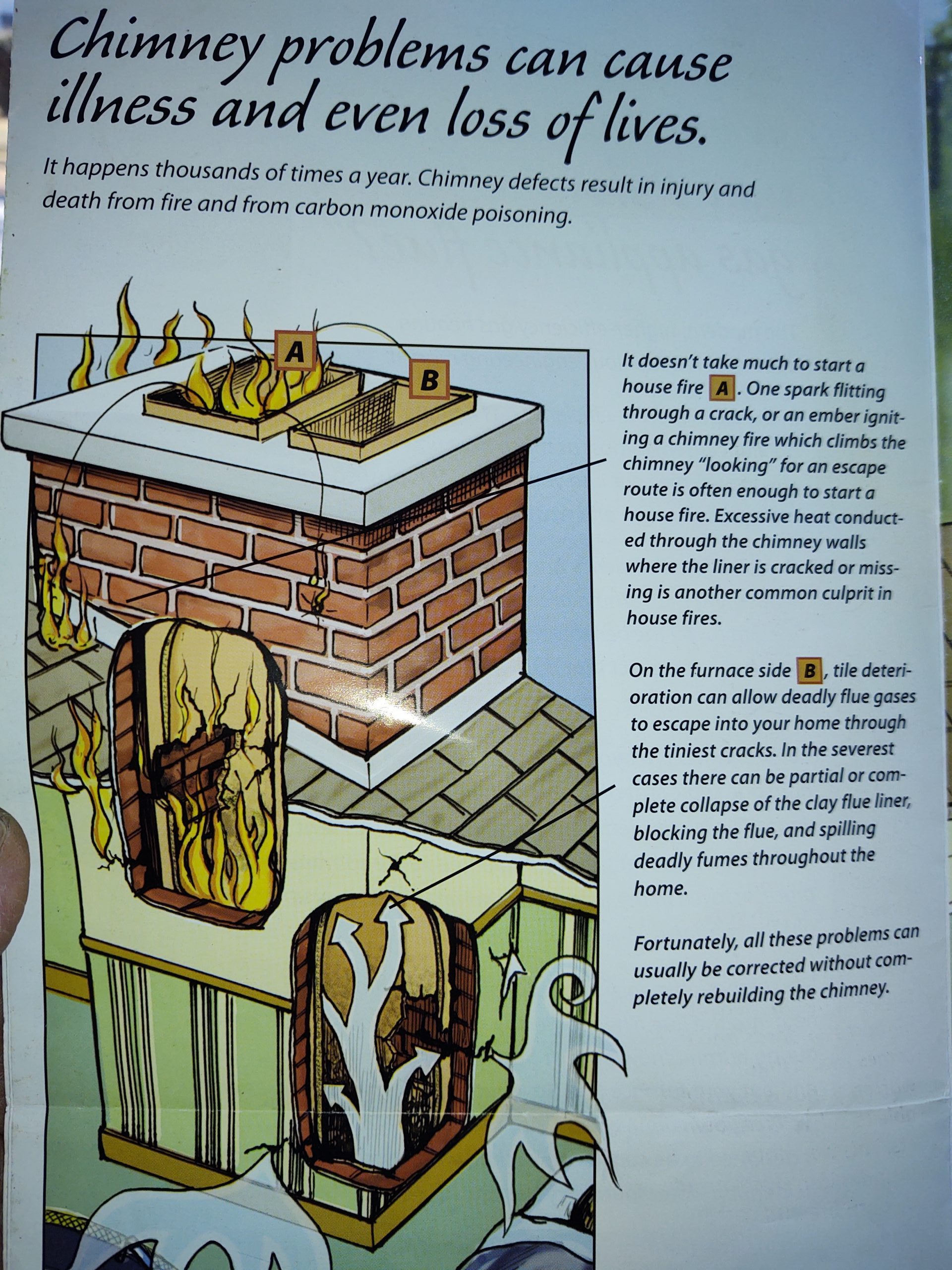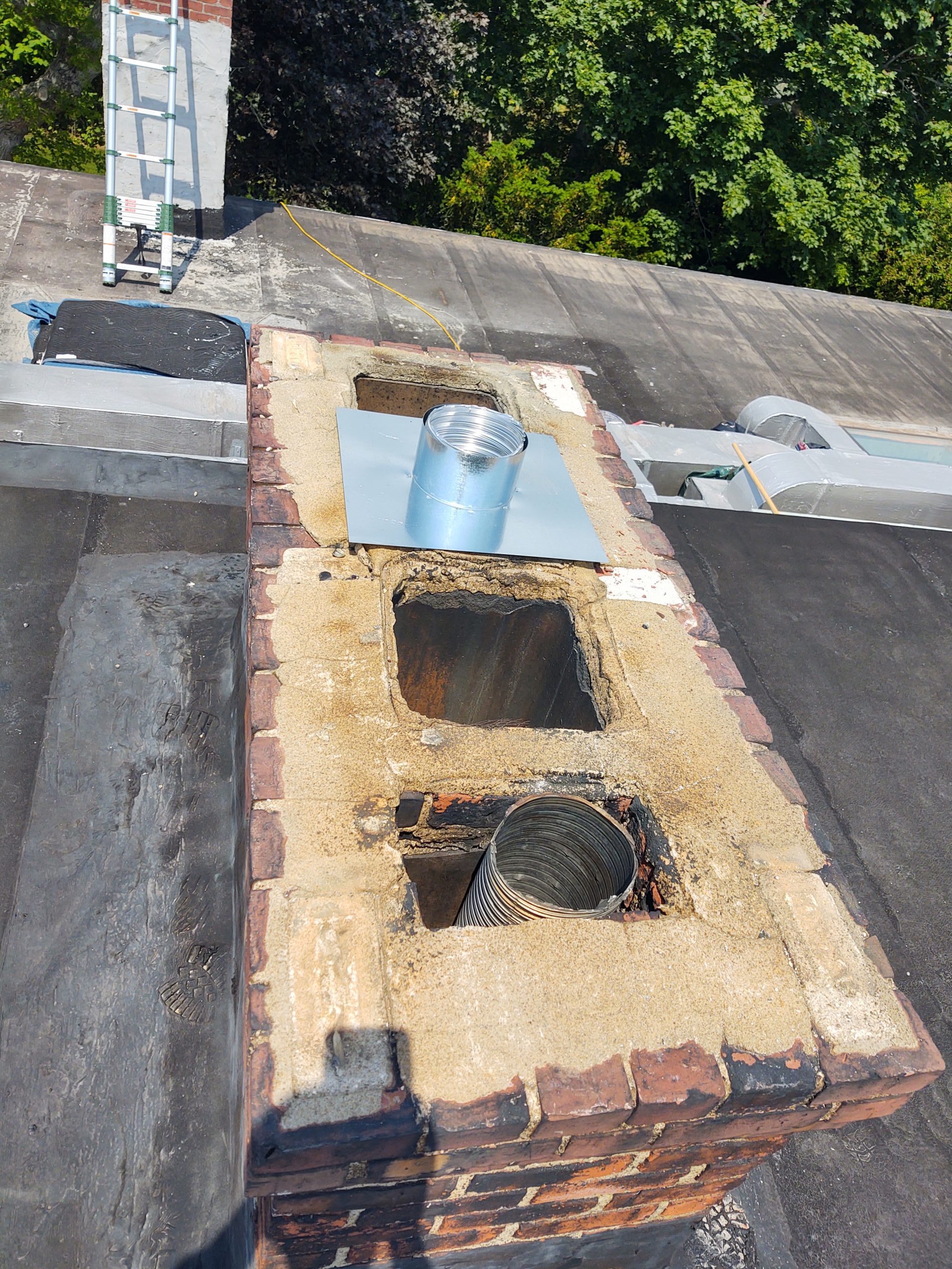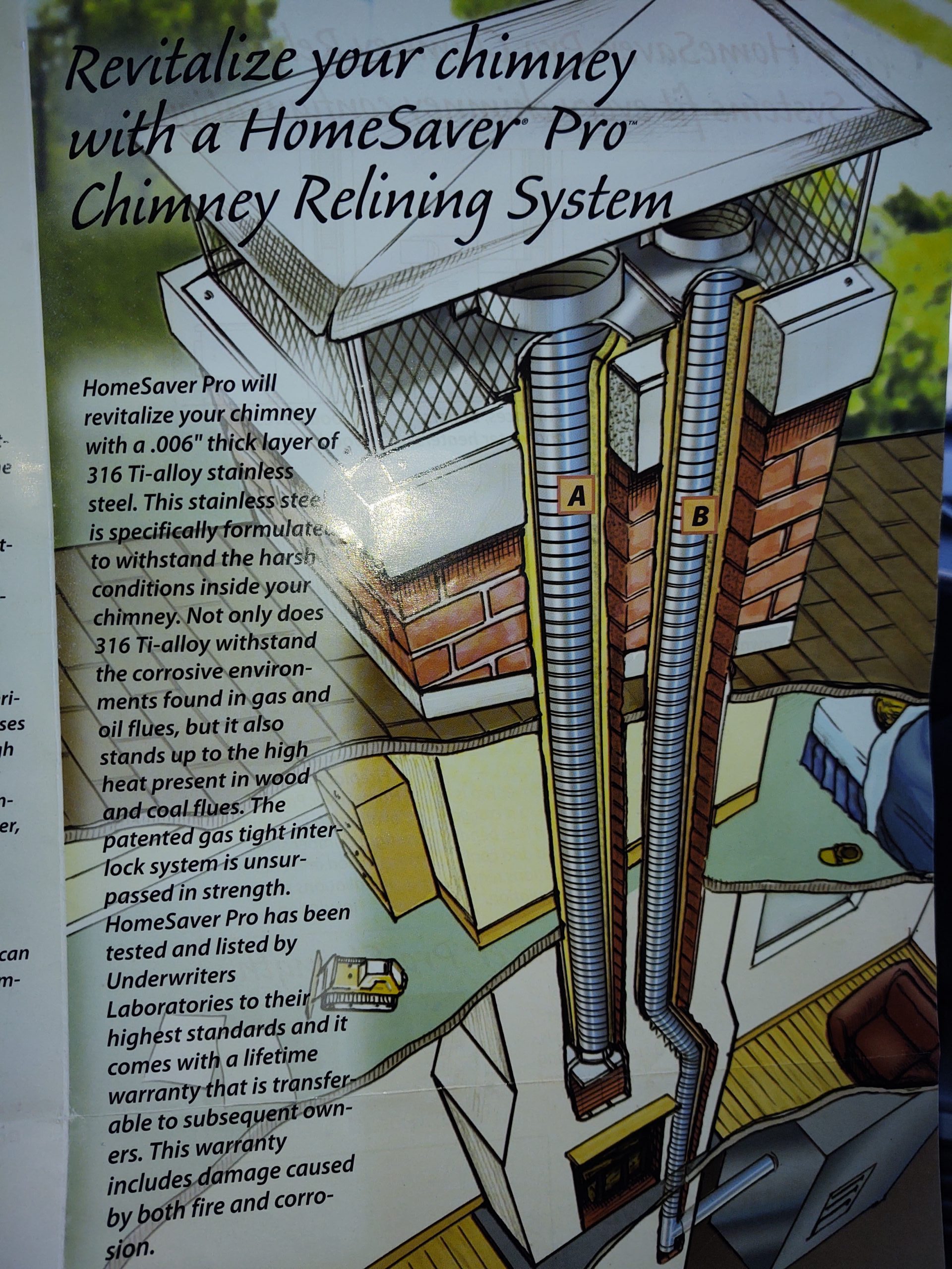 Do I need a chimney liner ?? Is a very common question asked. To answer that we will briefly go over what a chimney liner is and why it is beneficial. Chimneys by definition are required to withstand very high temperatures being produced by an appliance in your home or business which burns flammable and or explosive heating fuel sources, such as heating oil, gas, propane, or wood logs. Throughout the years these high temperatures test the integrity of your chimney flue ( the conduit in which the smoke or exhaust goes up and out ) . Every time your burner cycles in and out during very cold weather in the winter months, all components expand to their limits from the heat, then drastically cool down while not running. These broad temperature variations cause the materials involved to crack and weaken. Chimney Lining Systems are then installed which are designed to expand and retract, thus provided a safe and sterile conduit for the exhausting gases, while also protecting your appliances such as boilers, burners, water heaters from harmful crumbling particles that have built up in your system throughout the years.
